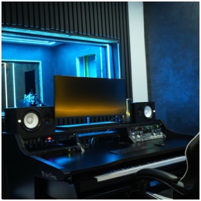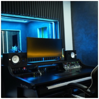 A hybrid writing and demo room for creatives who need flexibility. No separate booth, but a mic can be set up in-room. Also ideal for songwriting sessions, streaming setups, or smaller vocal recordings.