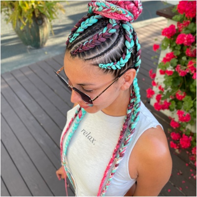 Half up-half down hairstyle with hair extensions included. Includes 7 braids on the top and 4 braids on the bottom (the nape area). Fun and unique hairstyle that will make you stand out from the crowd.