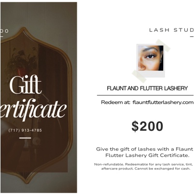Give the gift of lashes with a Flaunt & Flutter Lashery Gift Certificate. Perfect for birthdays, holidays, or just because, our certificates can be applied toward any lash service.