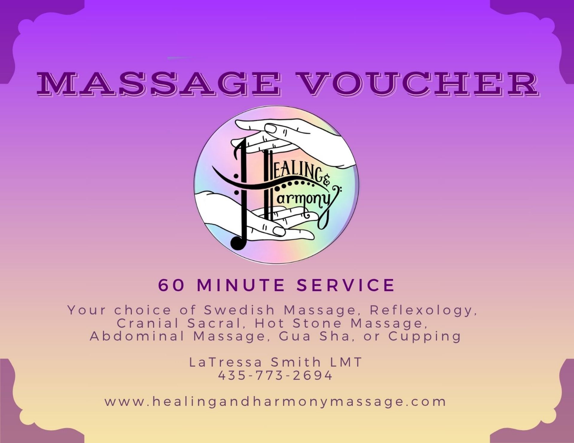 Custom 2 Hour massage, a combination of techniques and modalities are utilized .