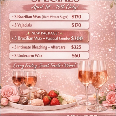 • 3 Brazilian Wax (Hard Wax or Sugar) – $170