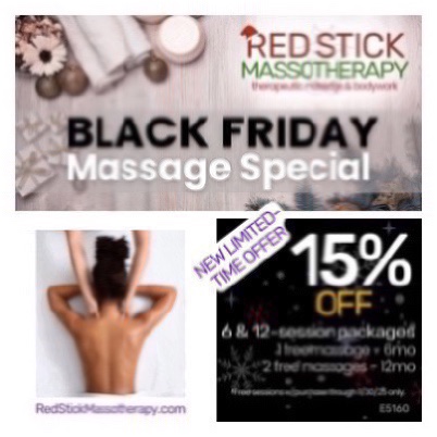 For new clients of Red Stick Massotherapy, please enjoy your first session at 15% off! (Applies to either a 90 or 120-minute in-office booking.)