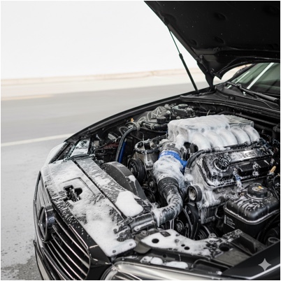 Professional cleaning and degreasing of the engine compartment for a showroom-quality appearance.