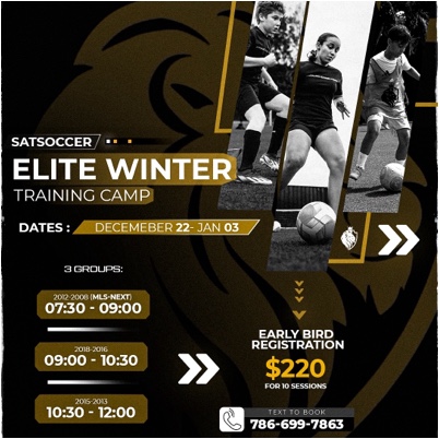 Elevate your game this winter with SATSoccer’s Elite Training Camp, designed for top-level players seeking advanced skills, tactical mastery, and peak performance. Each elite group will work with 3 expert coaches, with a maximum of 12 players per group, ensuring personalized attention and high-quality training. The program includes intense ball mastery, tactical development, speed training, and game simulation. Join us [Insert Dates] at [Insert Location]. Spaces are limited—register now to train like a pro!