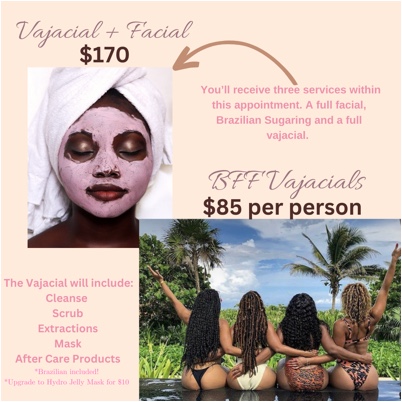 You’ll receive three services within this appointment. A full facial, Brazilian Sugaring and a full vajacial.