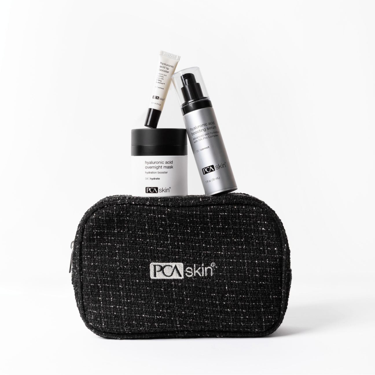 Packed in a beautiful cosmetic bag. Featuring best-seller Hyaluronic Acid Boosting Serum, Hyaluronic Acid Overnight Mask, and Hyaluronic Acid Lip Booster, this set is designed to provide intense hydration day and night.